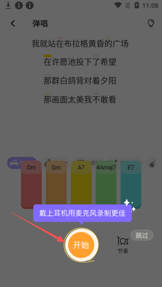 4、準備好后,點擊開始,即可進行歌曲彈唱,戴上耳機用麥克風錄制效果更佳。