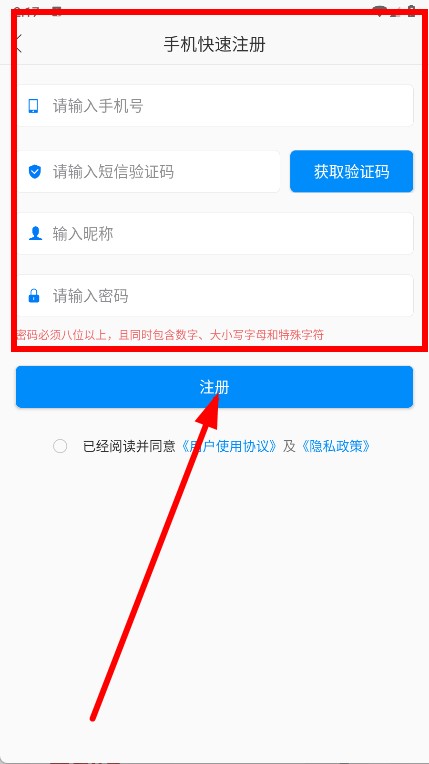 4、依次輸入手機(jī)號(hào),勾選同意相關(guān)協(xié)議后,點(diǎn)擊注冊。