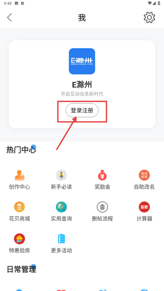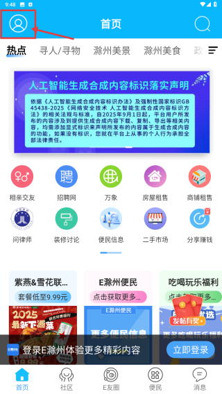1、打開E滁州APP,點擊首頁左上角頭像圖標,進入個人中心頁面。