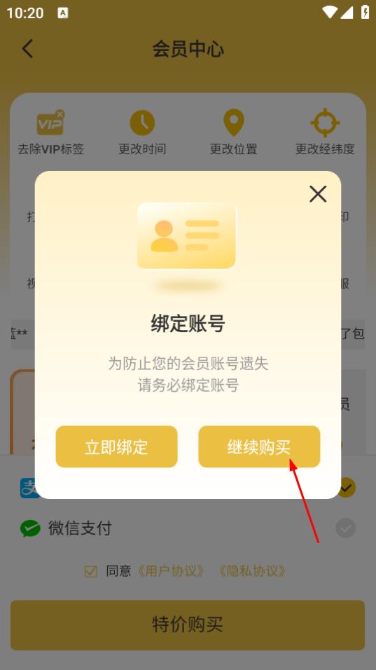 4、在綁定賬號提示框中,點擊繼續(xù)購買,完成會員購買操作。