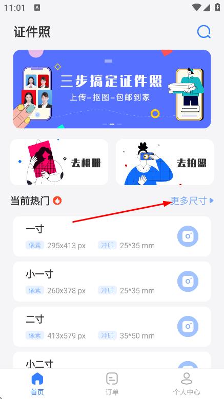 1、在首頁,點(diǎn)擊更多尺寸,進(jìn)入證件照尺寸選擇頁面。