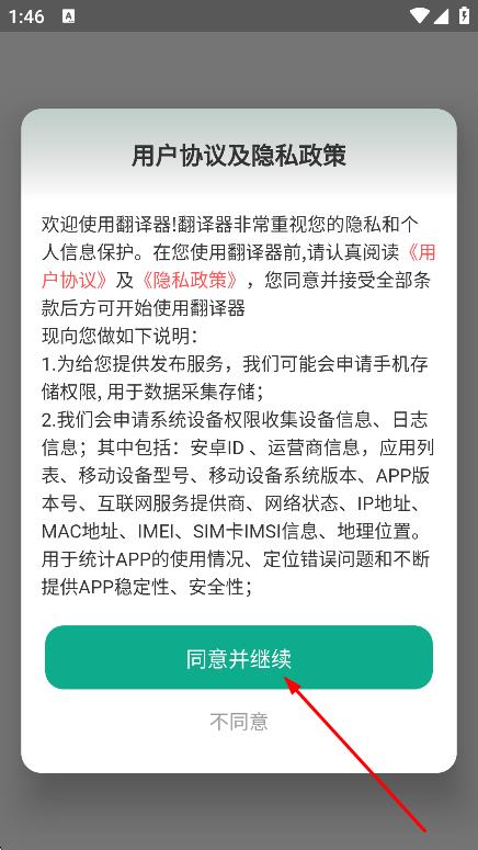 1、在用戶協(xié)議及隱私政策彈窗中,點擊同意并繼續(xù)。