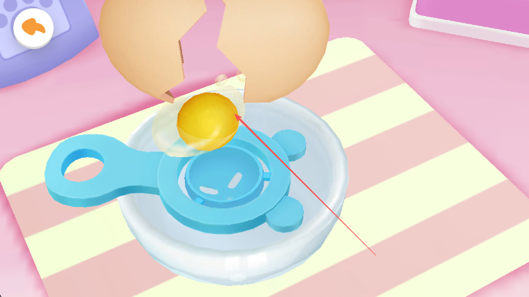 1、游戲開始,將雞蛋打破,把箭頭所指的蛋黃倒入藍(lán)色分離器中進(jìn)行分離。