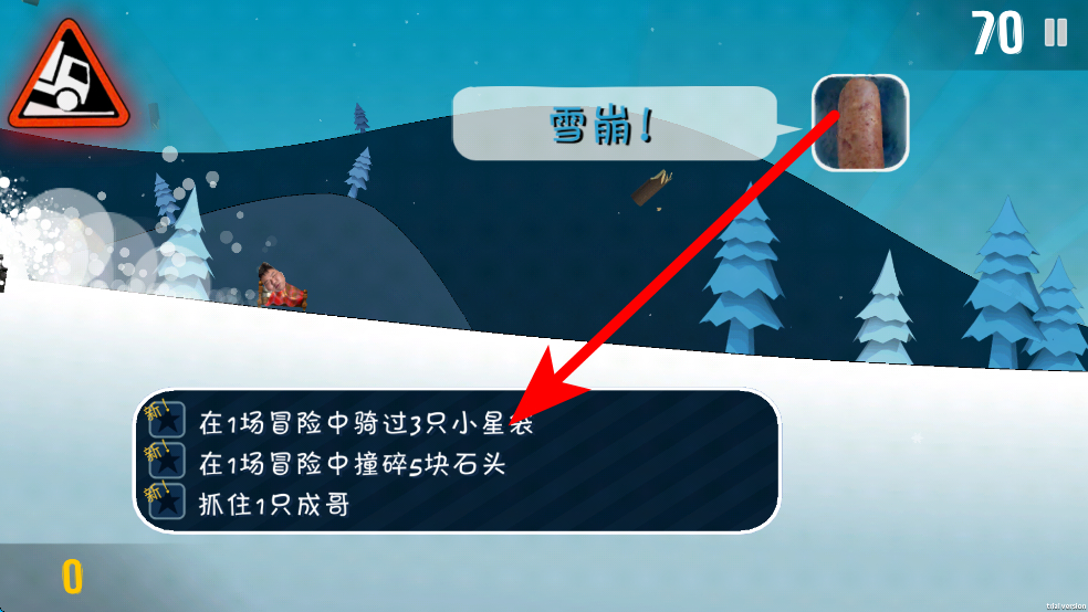 2、在滑行過程中,有各種任務(wù)需要完成,比如在一場冒險中騎過指定數(shù)量的小星象、撞碎一定數(shù)量的石頭等,玩家要努力完成這些任務(wù)。