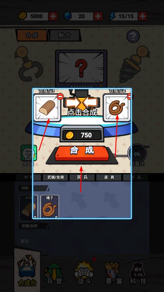 1、在合成界面,可消耗金幣將木材等材料點(diǎn)擊合成,得到繩子等道具,助力游戲進(jìn)程。