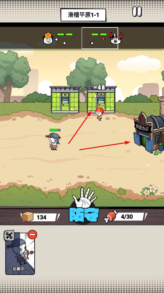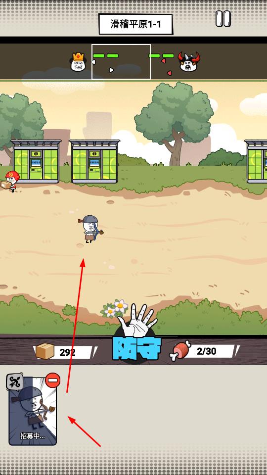2、進(jìn)入滑稽平原1-1等關(guān)卡,可招募士兵,操控士兵在場景中移動,與敵人展開戰(zhàn)斗。