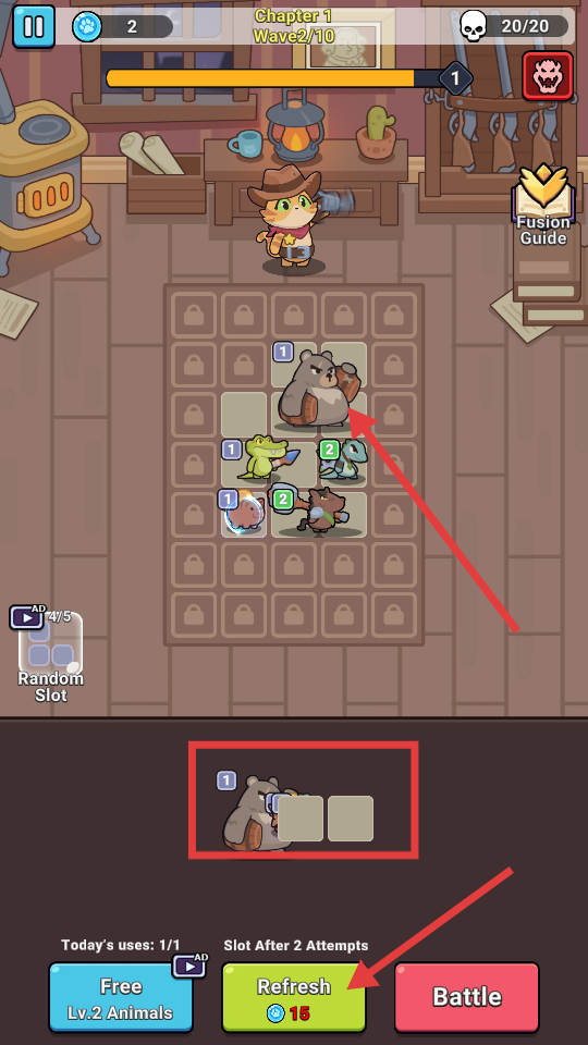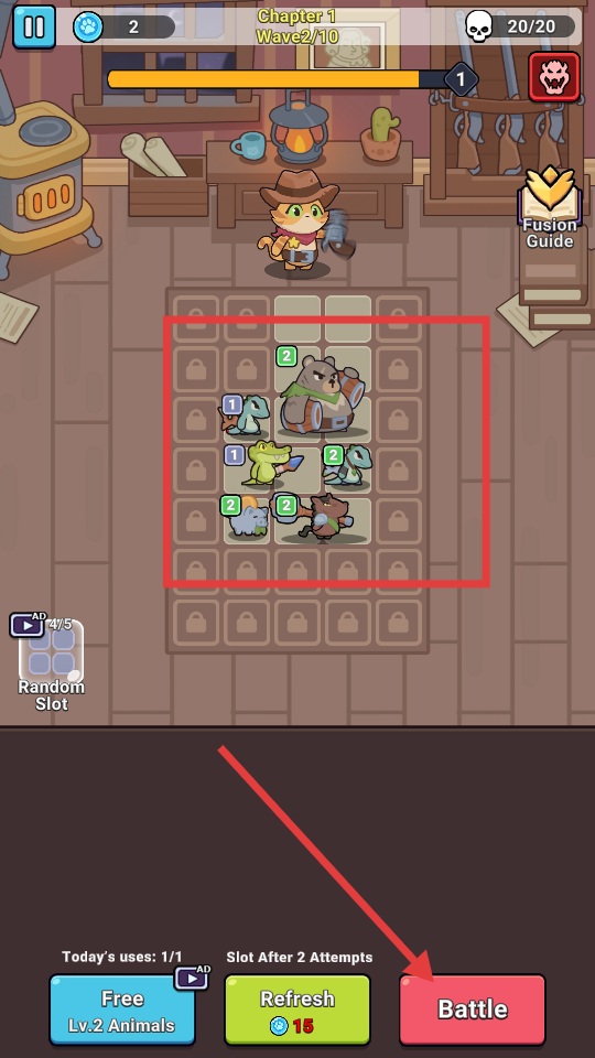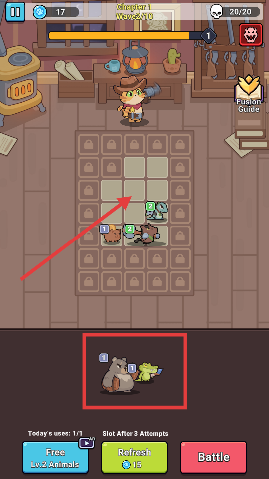 1、將下方紅色框內的等級1動物拖動到上方的空格位置,合理布置動物來為戰(zhàn)斗做準備。