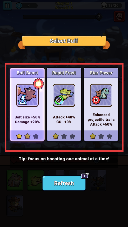 4、戰(zhàn)斗后會出現(xiàn)增益選擇界面,可從“Bolt-Boost”“Rapid-Frost”“Star-Power”中選一個buff,提升動物戰(zhàn)力。