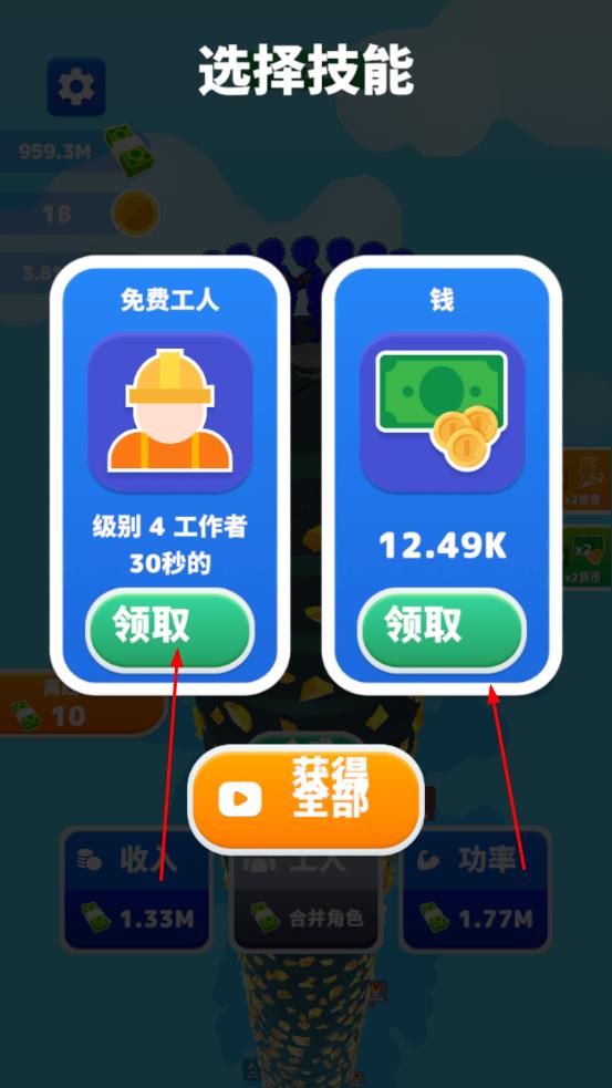 4、在選擇技能界面,能領(lǐng)取免費(fèi)工人或金錢等獎(jiǎng)勵(lì),進(jìn)一步提升游戲中的資源和人力,推動(dòng)游戲發(fā)展。
