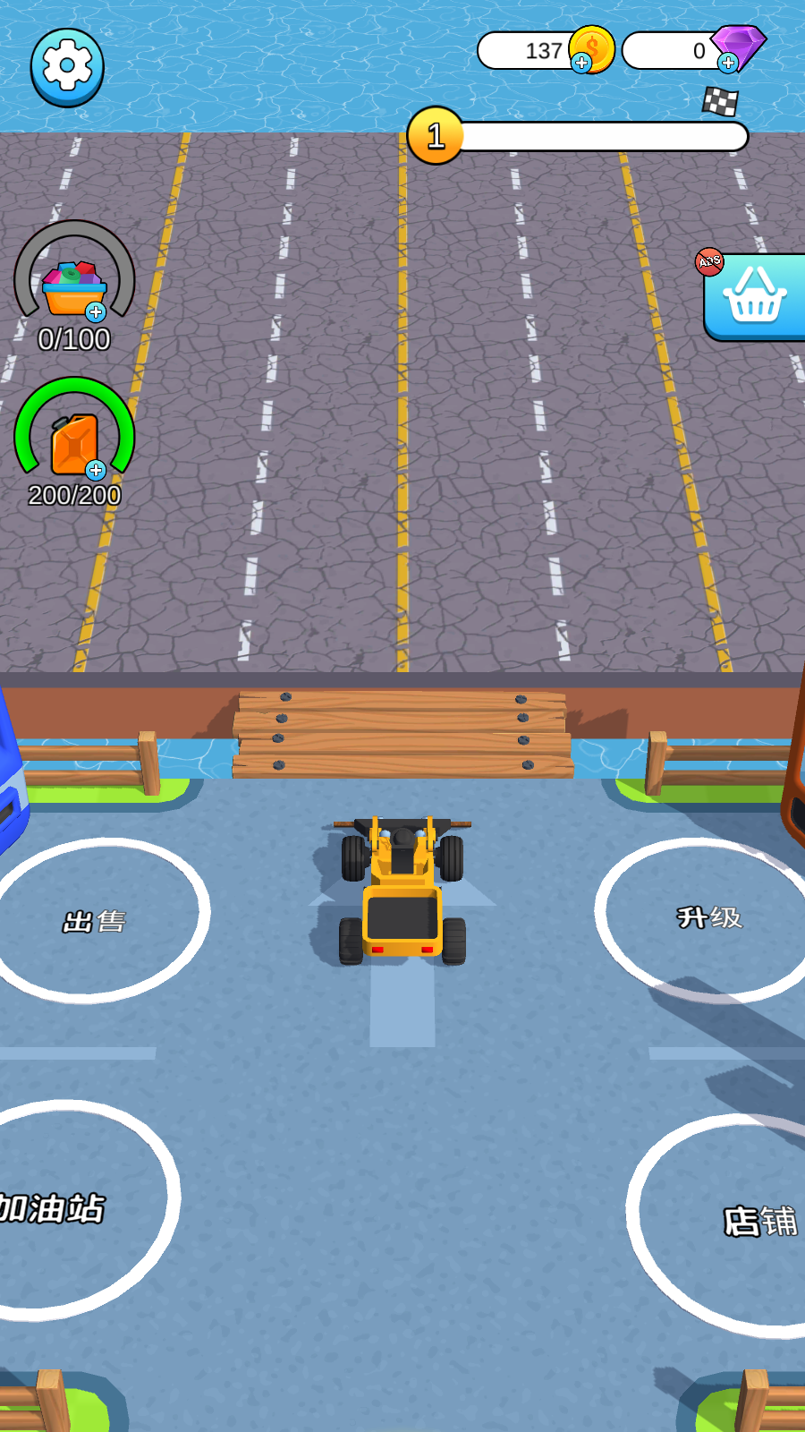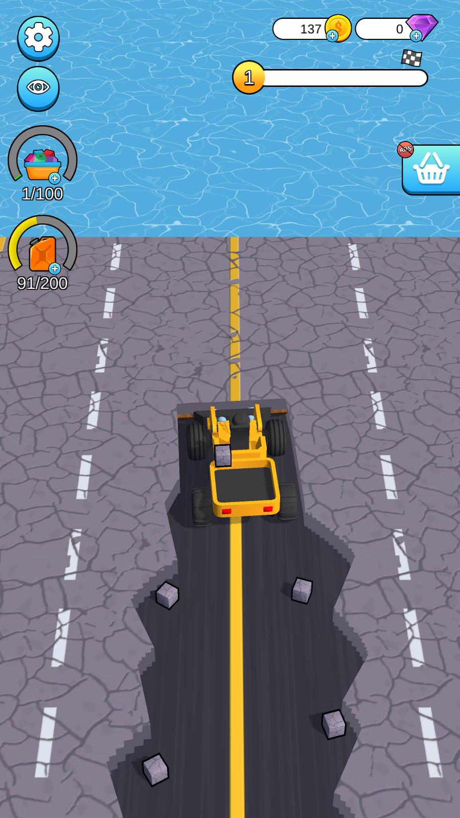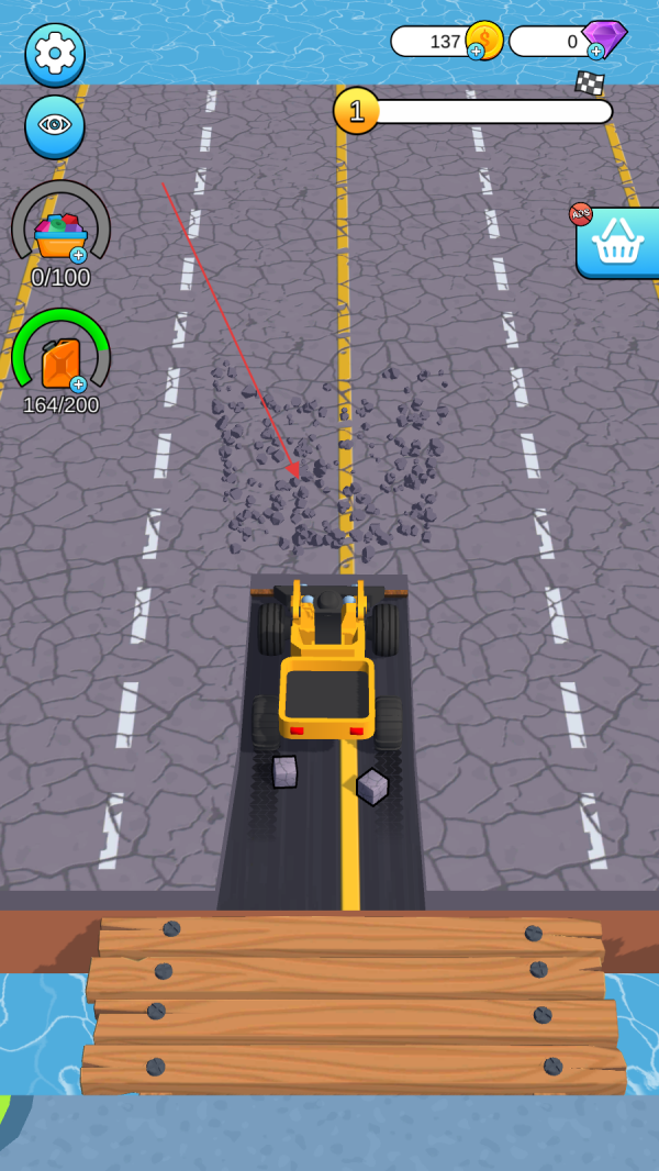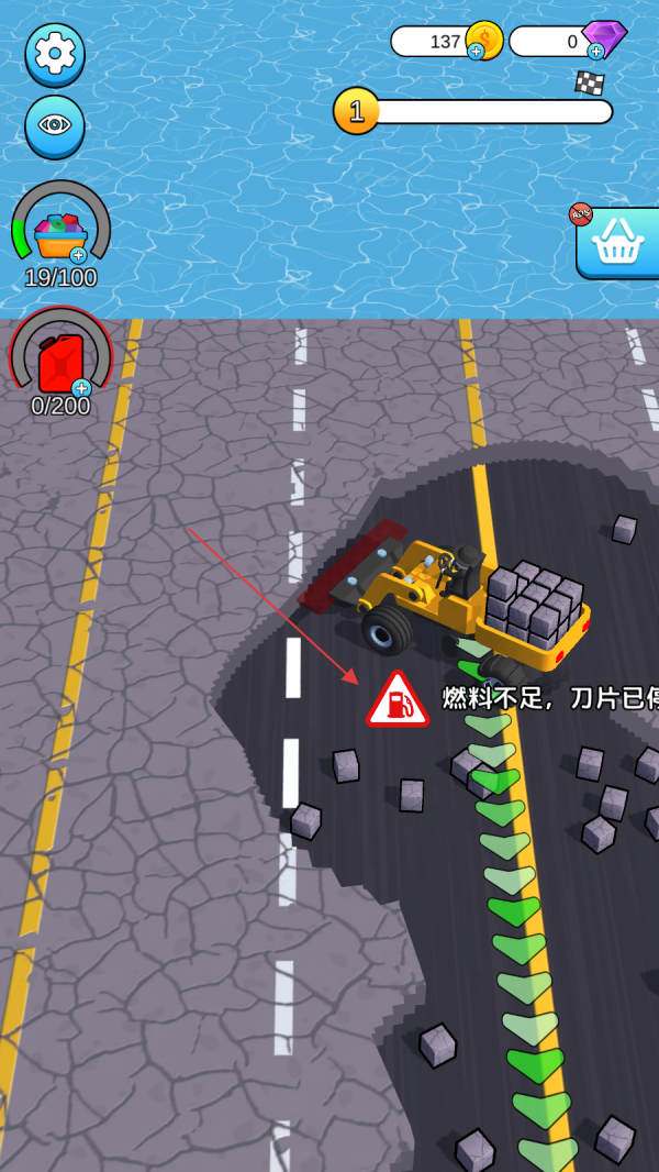 1、操控黃色工程車輛在路面行駛,點(diǎn)擊屏幕使車輛前方的破碎裝置啟動,將路面的石塊擊碎,同時留意車輛的燃料和裝載進(jìn)度,確保破碎作業(yè)能持續(xù)進(jìn)行。
