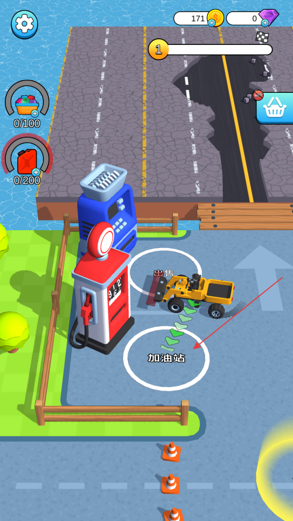 3、駕駛車輛向加油站方向移動,根據(jù)屏幕中的箭頭指引,將車輛行駛至標(biāo)有“加油站”的白色圓圈區(qū)域內(nèi),準(zhǔn)備進(jìn)行燃料補(bǔ)充操作。