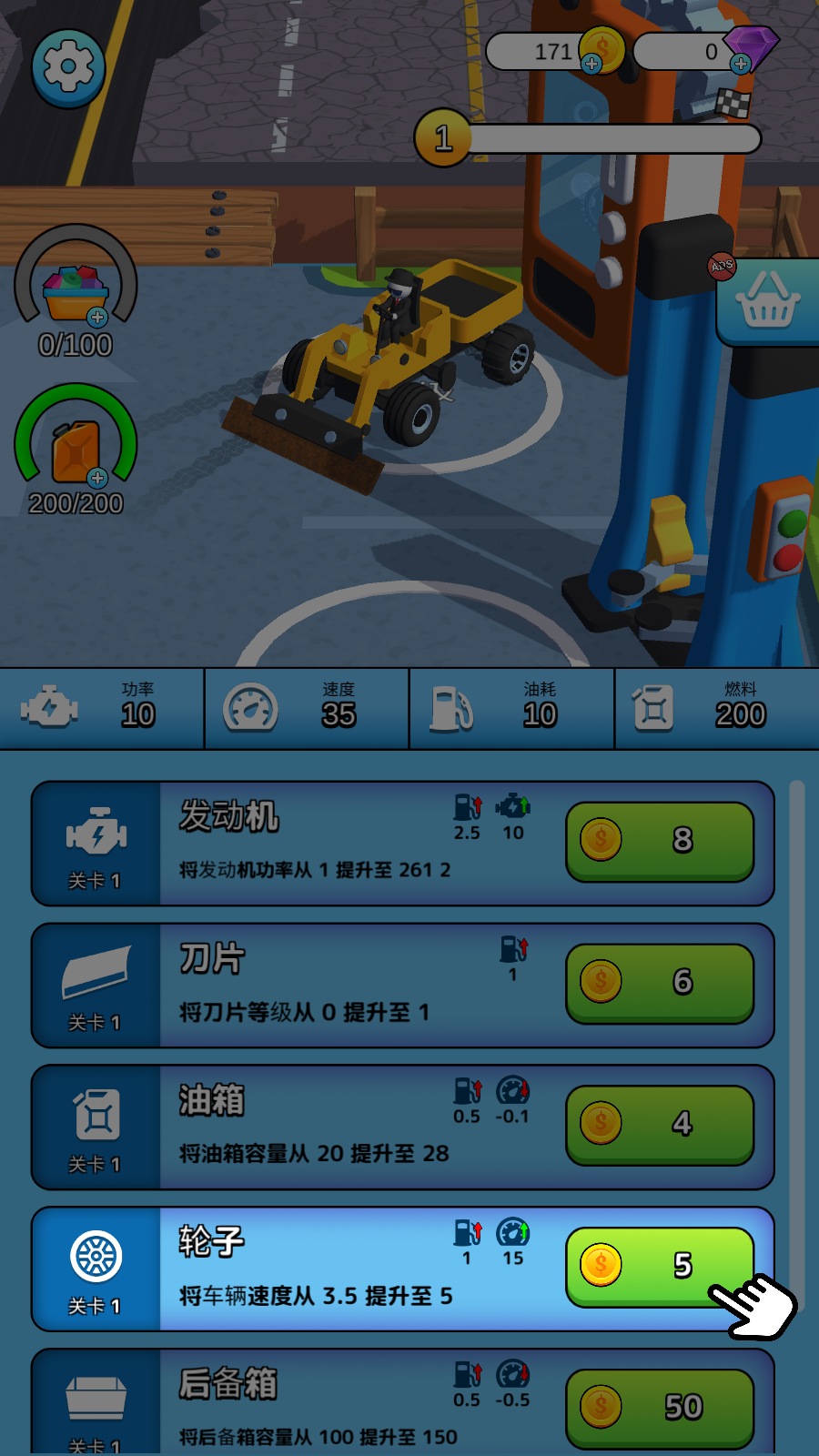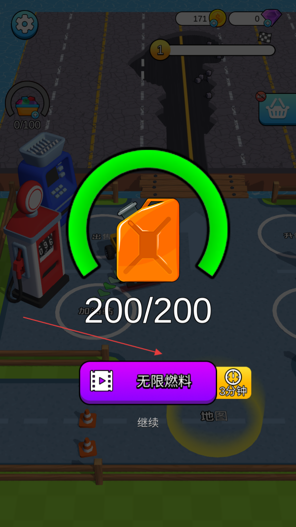 4、車輛進(jìn)入加油站區(qū)域后,等待燃料補(bǔ)充進(jìn)度條加載完成,當(dāng)顯示“200/200”時,可選擇點(diǎn)擊“無限燃料”按鈕(或直接繼續(xù)),使車輛燃料恢復(fù)至滿值,以便繼續(xù)進(jìn)行路面破碎作業(yè)。