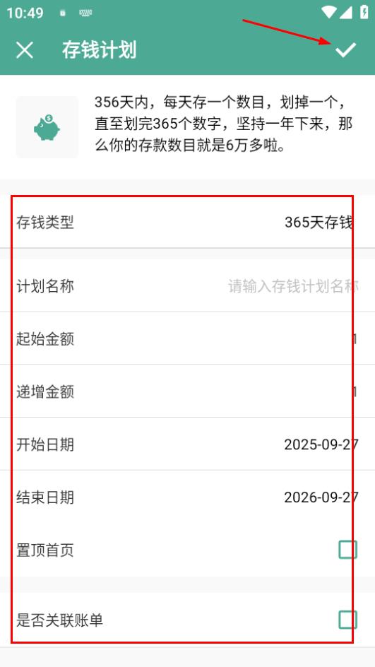 4、填寫好信息后,點擊頁面右上角的對勾圖標,即可完成存錢計劃的設(shè)置。
