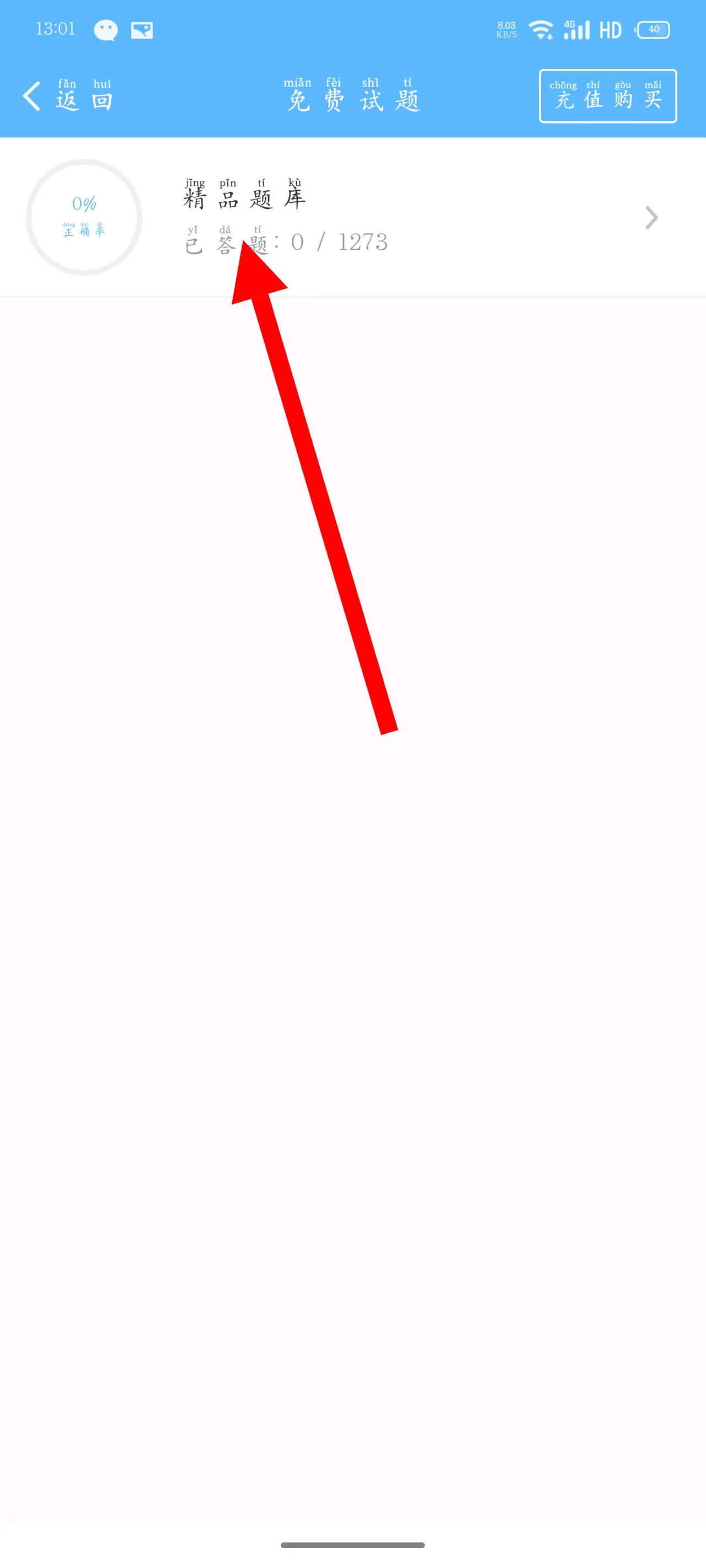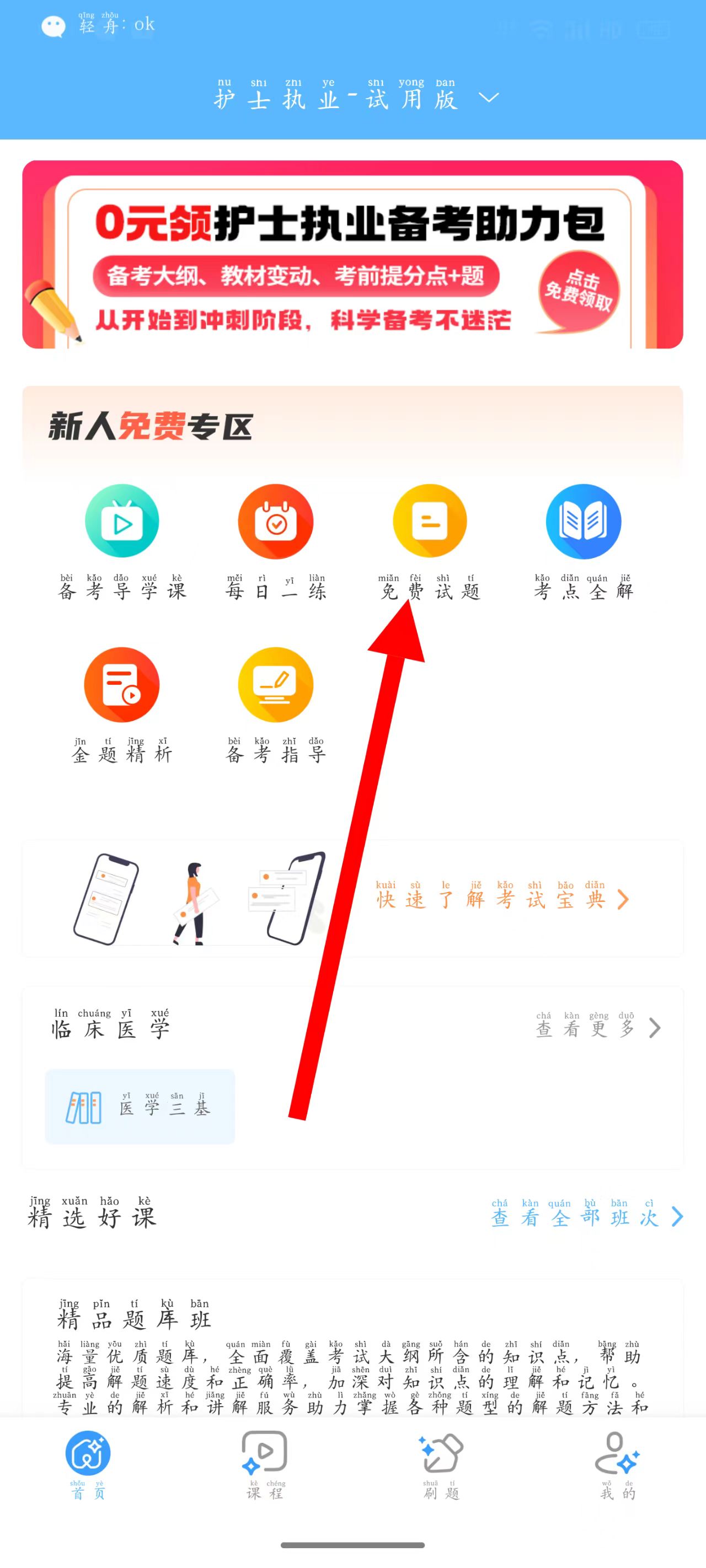 1、打開APP,進入首頁后,點擊免費試題選項。