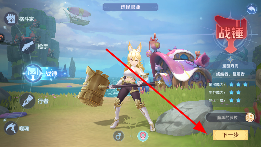1、進(jìn)入游戲后,在格斗家、槍手、戰(zhàn)錘等職業(yè)中選擇,不同職業(yè)有不同的特點(diǎn)與能力,選好職業(yè),開(kāi)啟在云上城的冒險(xiǎn)征程。