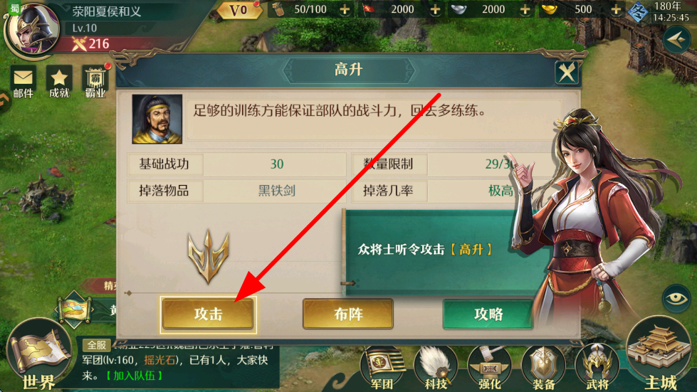 2、名將招募培養(yǎng):通過(guò)酒館尋訪戰(zhàn)役俘虜?shù)确绞绞占鋵?,消耗兵書提升其統(tǒng)率值,搭配專屬裝備坐騎激活組合技形成戰(zhàn)場(chǎng)壓制力。