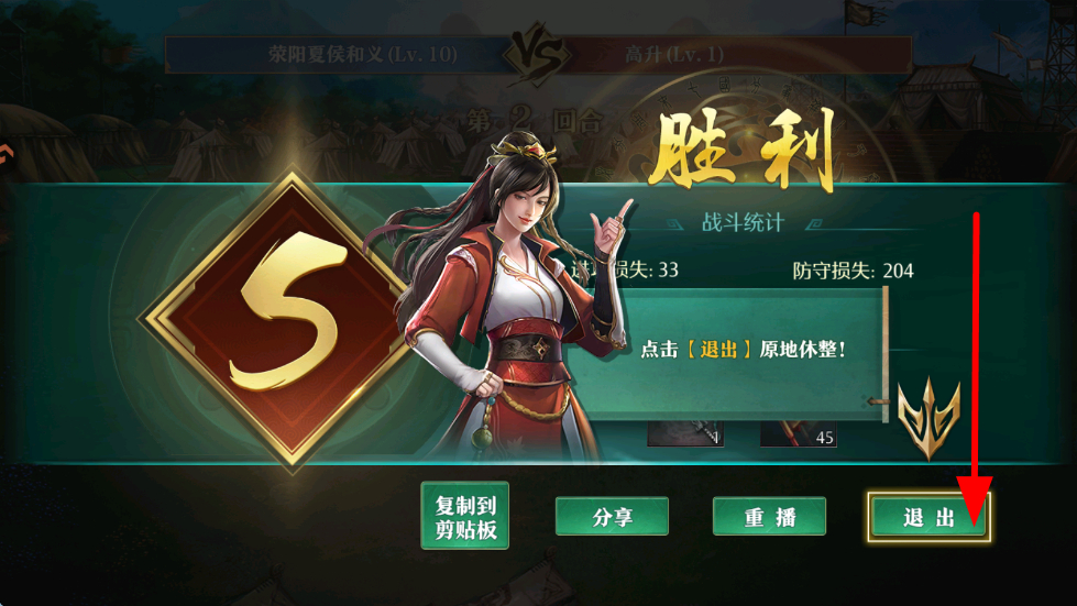4、戰(zhàn)斗結(jié)束后,會(huì)顯示戰(zhàn)斗結(jié)果,若取得勝利,可查看戰(zhàn)斗統(tǒng)計(jì),了解損失等情況,之后點(diǎn)擊退出,結(jié)束此次戰(zhàn)斗。