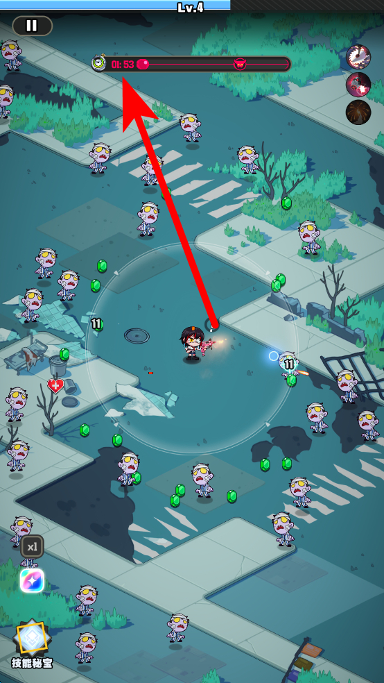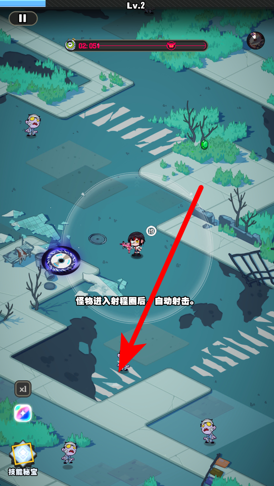 1、進(jìn)入后,操控角色在場景中移動,當(dāng)怪物進(jìn)入角色的射程圈后,角色會自動射擊,此時需關(guān)注怪物位置,調(diào)整角色移動,讓射擊更高效。