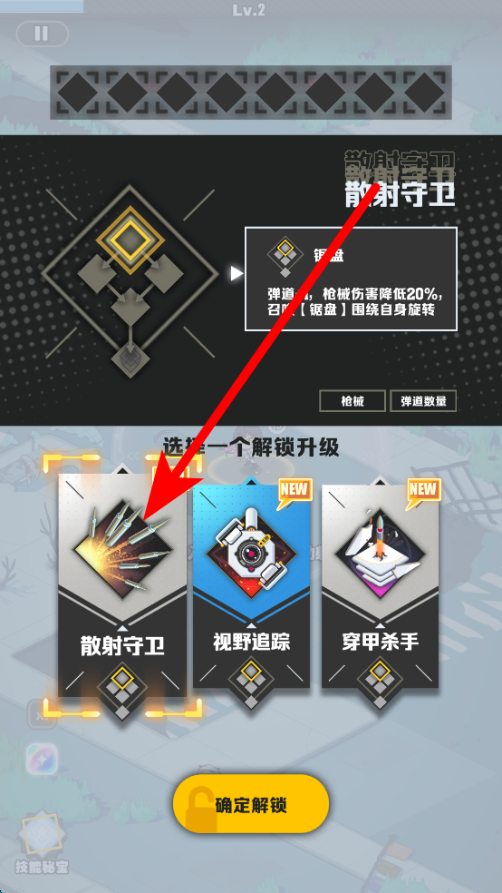 2、在戰(zhàn)斗過程中,會出現(xiàn)技能解鎖升級選項,可根據(jù)戰(zhàn)斗需求,選擇合適的技能,如散射守衛(wèi)等,點擊確定解鎖,增強(qiáng)角色的攻擊能力。