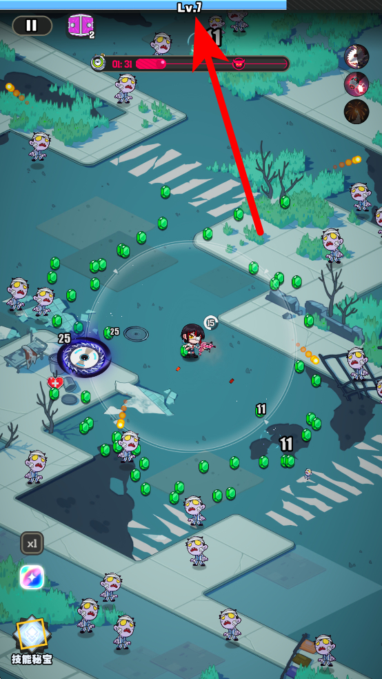 4、隨著游戲進(jìn)行,角色等級會提升,等級提升后,場景中怪物的數(shù)量和強(qiáng)度都會增加,此時要更靈活地移動角色,躲避怪物攻擊。