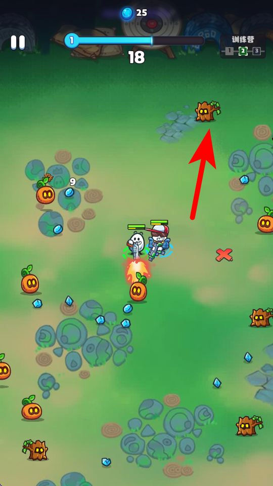 3、戰(zhàn)斗時(shí)要應(yīng)對場景元素,場景里有南瓜、樹樁等,還有敵人出現(xiàn),玩家操控角色和伙伴,利用技能攻擊敵人,同時(shí)收集散落的藍(lán)色晶體,提升闖關(guān)收獲。