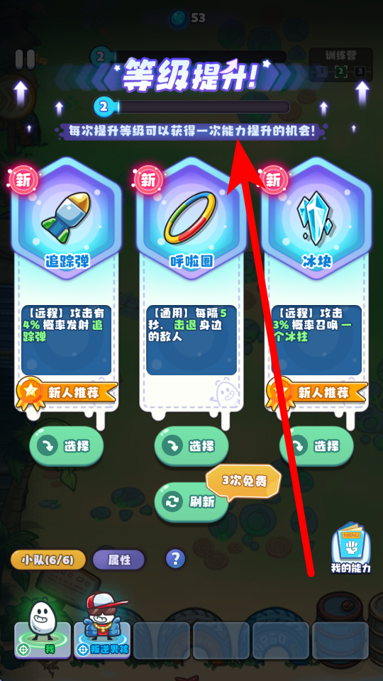 4、等級提升有獎勵(lì),每次提升等級可獲得能力提升機(jī)會,能從追蹤彈、呼啦圈、冰塊等技能里選,不同技能作用不同。