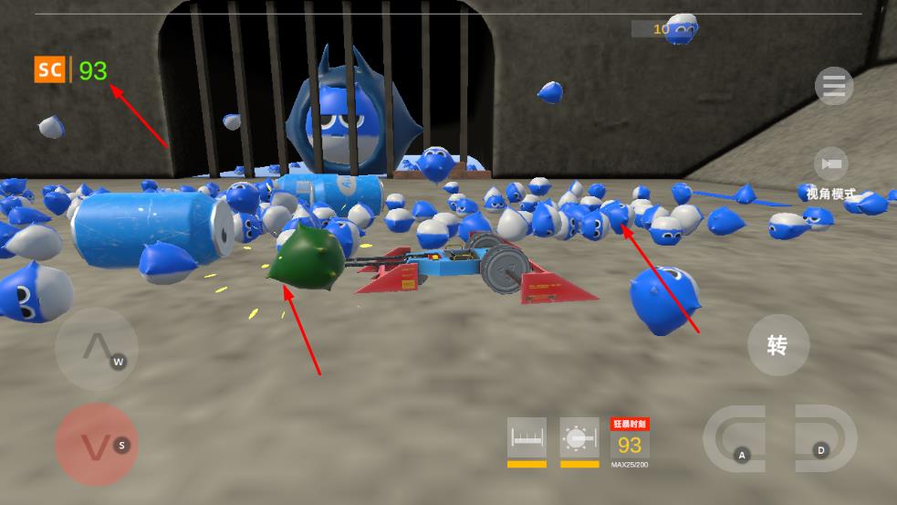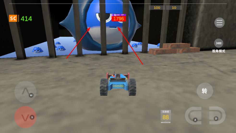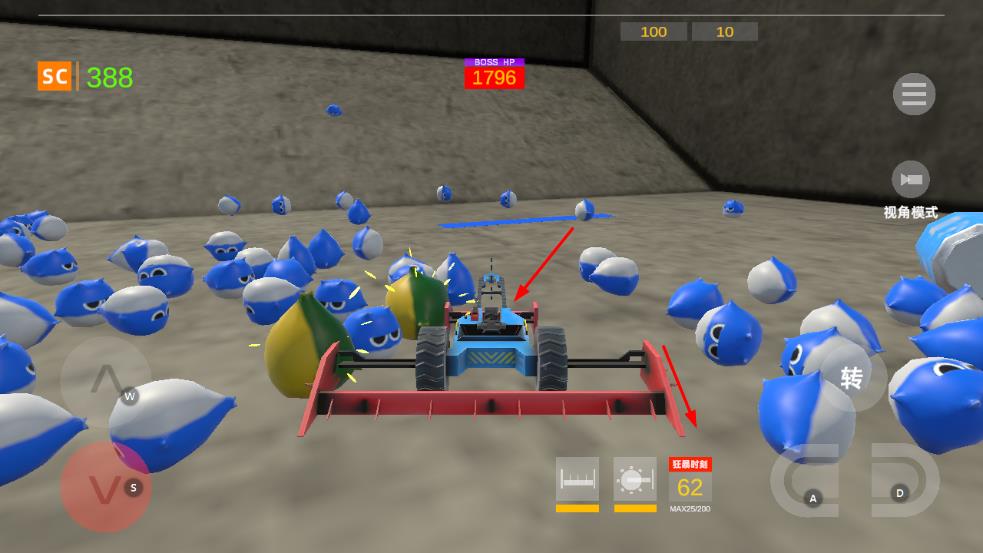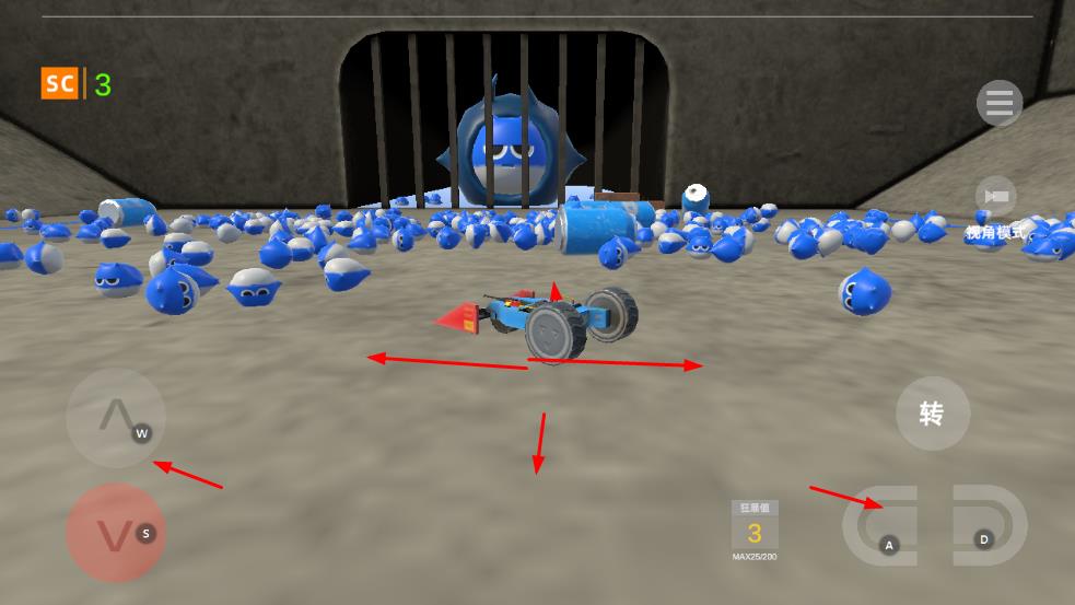 1、通過W、S、A、D等按鍵操控車輛在場(chǎng)景中移動(dòng),穿梭于藍(lán)色小怪物之間。