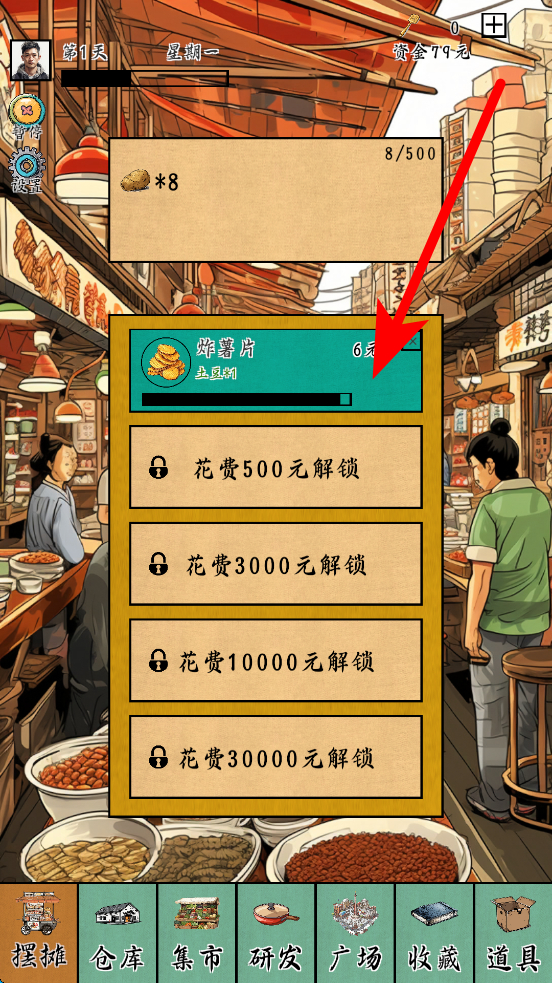 3、對(duì)于選中的小吃,可花費(fèi)相應(yīng)資金進(jìn)行解鎖,不同階段解鎖所需資金不同,解鎖后能提升小吃的售賣(mài)等相關(guān)能力,助力經(jīng)營(yíng)。