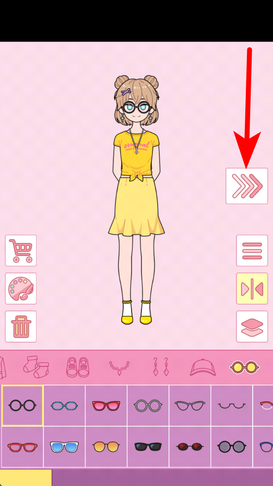 3、在換裝界面,從下方眾多裝扮選項中,選擇喜歡的元素為角色進行裝扮,比如挑選眼鏡、衣服等,裝扮完成后,點擊相應箭頭按鈕可進行下一步。
