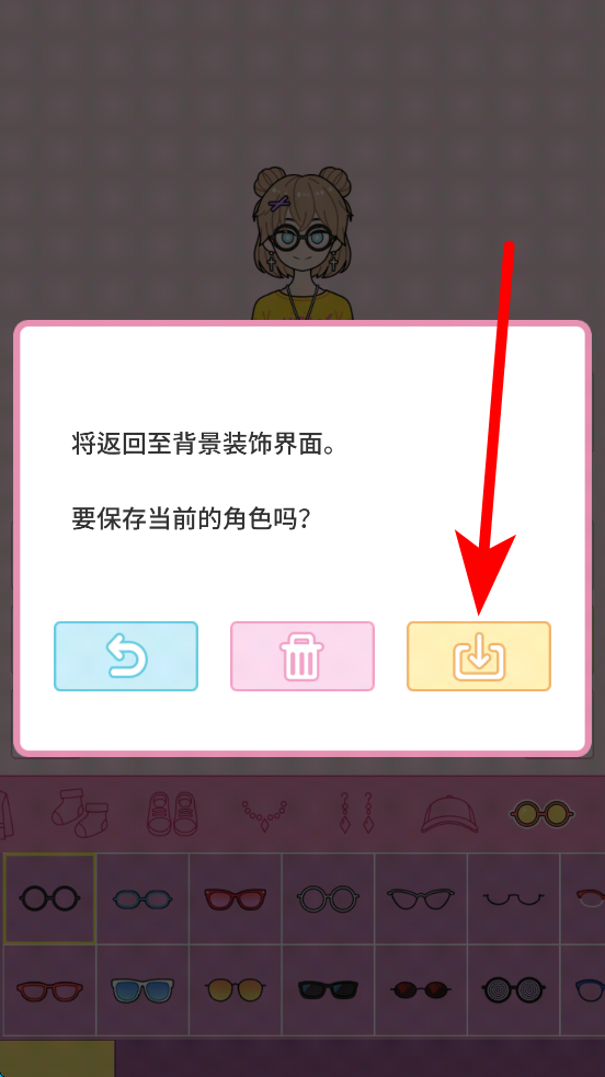 4、當要返回背景裝飾界面時,會彈出是否保存當前角色的提示,若想保存精心裝扮的角色,就點擊保存按鈕,這樣角色裝扮就成功保存了。