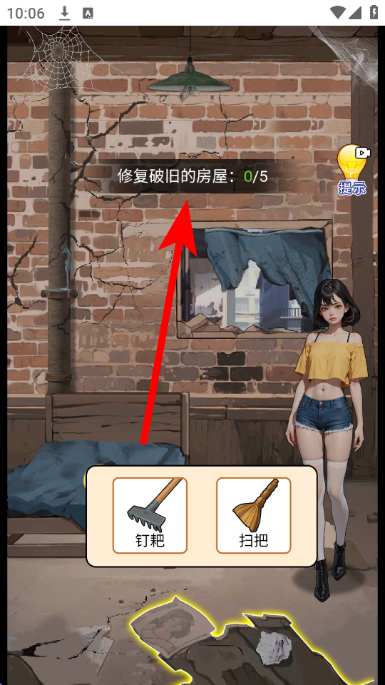 1、根據(jù)提示要修復(fù)破舊的房屋,當(dāng)前進(jìn)度,可使用界面中的釘耙或掃把等工具來推進(jìn)修復(fù)進(jìn)程。