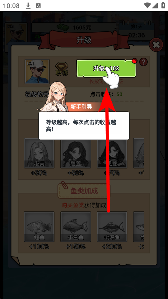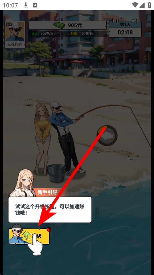 3、在釣魚場景中,按照新手引導(dǎo)的提示,點(diǎn)擊左下角的升級按鈕,這樣可以加速賺錢的速度。