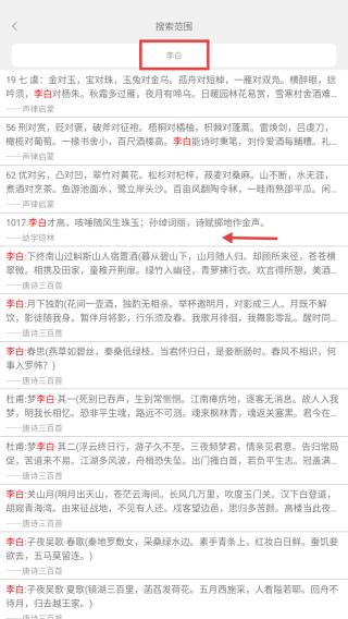 3、在搜索結(jié)果中找到目標(biāo)詩詞內(nèi)容,點擊進入詩詞詳情頁。