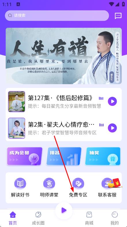 2、在君子學堂主頁面,點擊免費專區(qū),進入免費專區(qū)頁面。