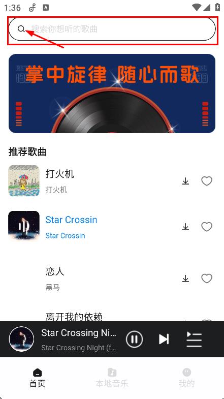 1、在應(yīng)用首頁,點(diǎn)擊搜索你想聽的歌曲的搜索框,進(jìn)入搜索頁面。