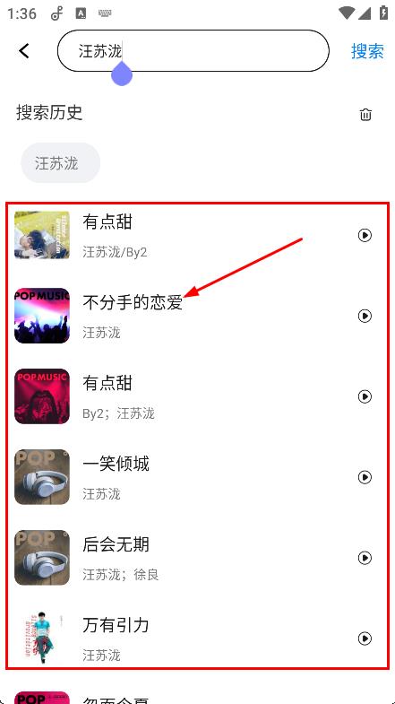3、在搜索結(jié)果中,選擇想聽的歌曲,如不分手的戀愛,進(jìn)入音樂播放頁面。