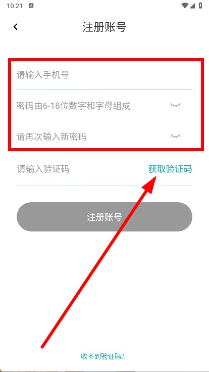 3、輸入手機(jī)號(hào)、設(shè)置密碼并再次確認(rèn)密碼,點(diǎn)擊獲取驗(yàn)證碼。