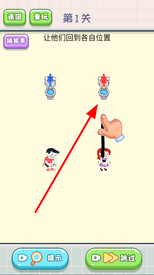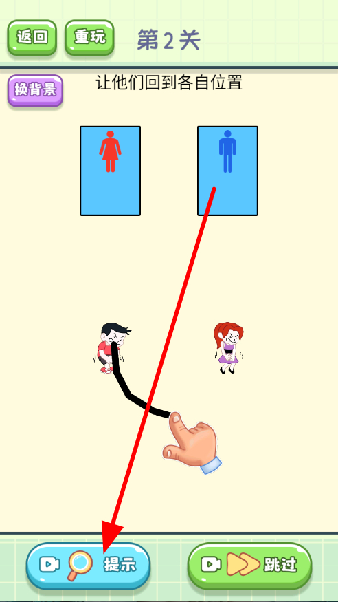 4、要是在關(guān)卡挑戰(zhàn)過程中遇到困難,可點(diǎn)擊提示按鈕,獲取相關(guān)提示,借助提示更好地完成畫線和人物歸位操作。