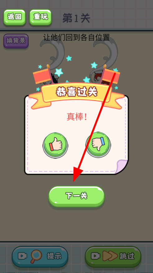 3、當(dāng)成功讓人物回到各自位置后,就能通關(guān),通關(guān)后可點(diǎn)擊下一關(guān),繼續(xù)挑戰(zhàn)新的關(guān)卡,體驗(yàn)更多內(nèi)容。