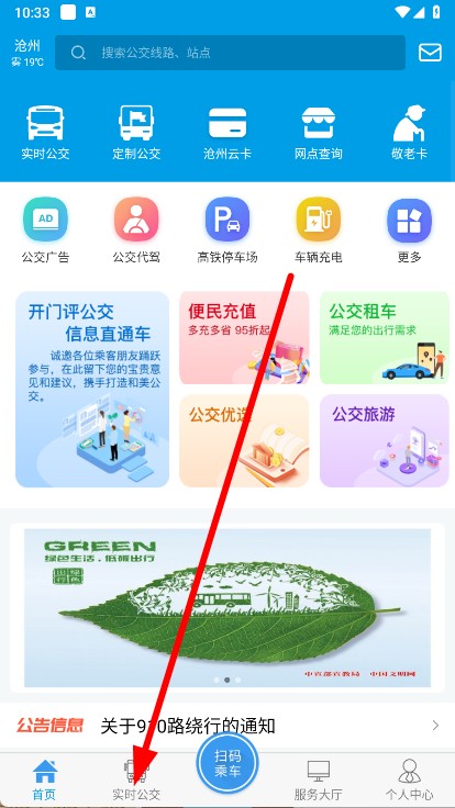 1、打開滄州行2.0APP,點(diǎn)擊底部實(shí)時(shí)公交。