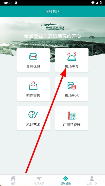 2、進(jìn)入玩轉(zhuǎn)機(jī)場頁面后,點擊機(jī)場美食選項。