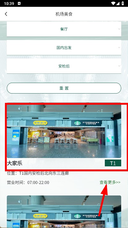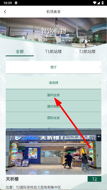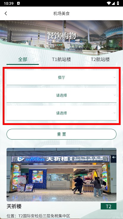 3、在機(jī)場美食頁面,通過頂部篩選欄選擇區(qū)域。