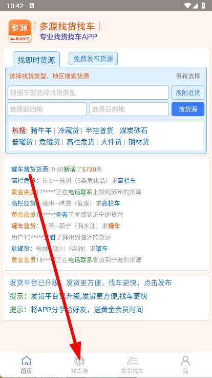 1、打開多源找貨找車APP,點擊底部找貨源。