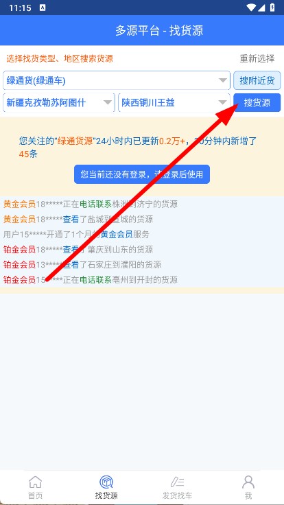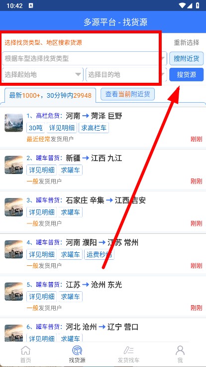 2、在找貨源頁面,選擇找貨類型、起始地和目的地,點擊搜貨源。