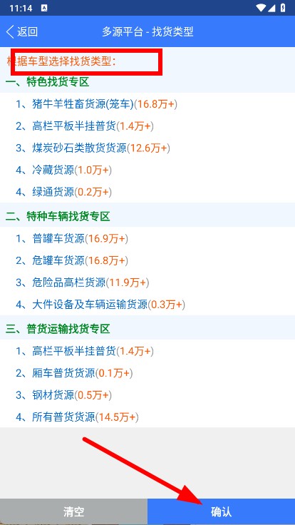 3、進(jìn)入找貨類型選擇頁面,挑選合適的找貨類型后,點擊確認(rèn)。