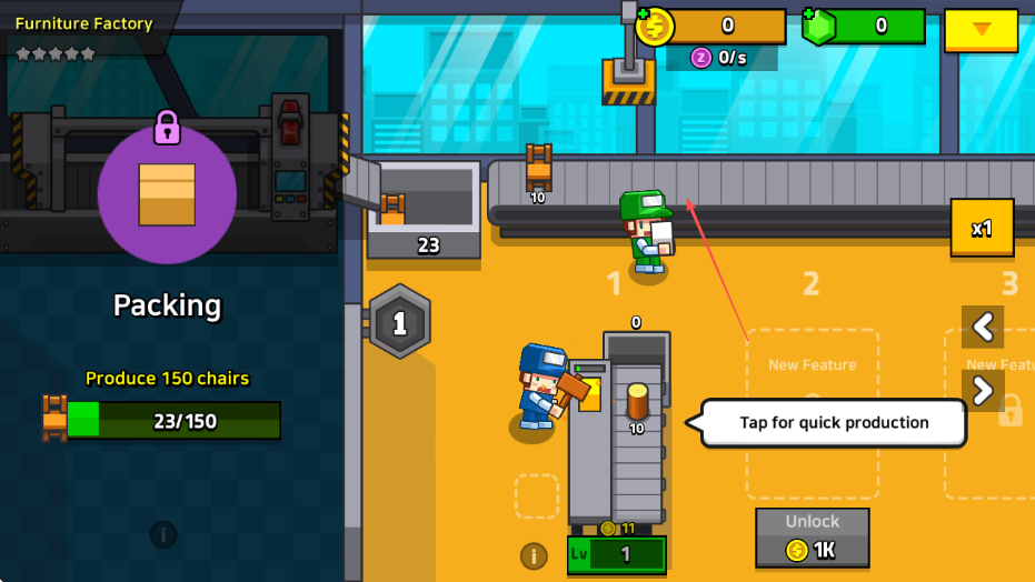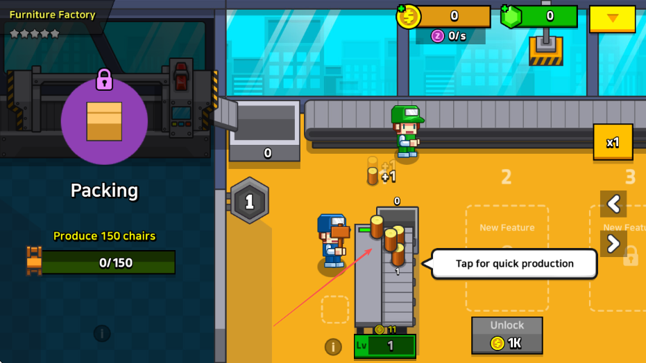 1、進(jìn)入游戲Furniture Factory界面,明確任務(wù)Produce150chairs,點(diǎn)擊工人加快椅子生產(chǎn)。