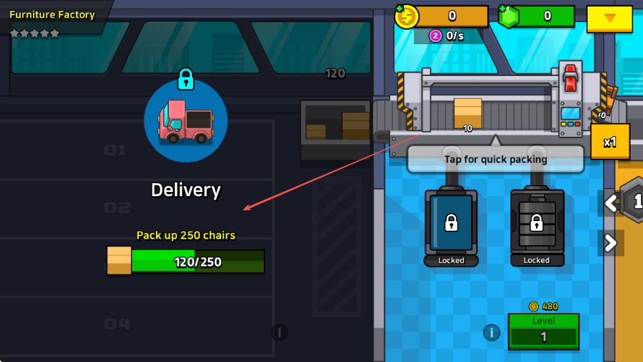 4、完成椅子生產(chǎn)任務(wù)后,解鎖新任務(wù)Pack up 250 chairs,按要求進(jìn)行打包交付。