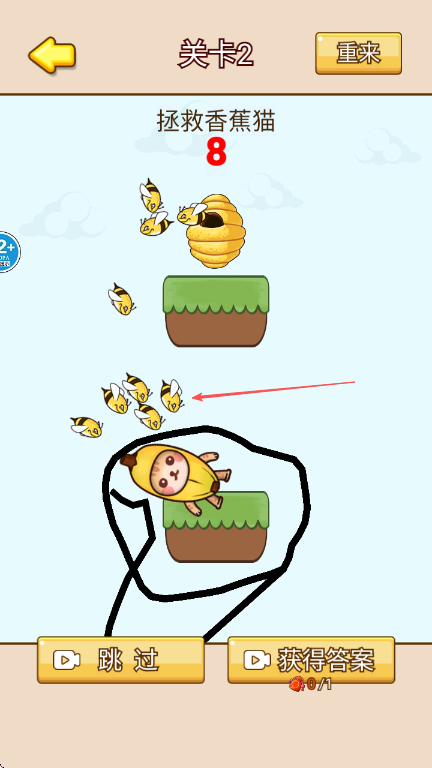3、當蜂巢中的蜜蜂被放出后,確保所畫線條能阻擋蜜蜂攻擊香蕉貓。