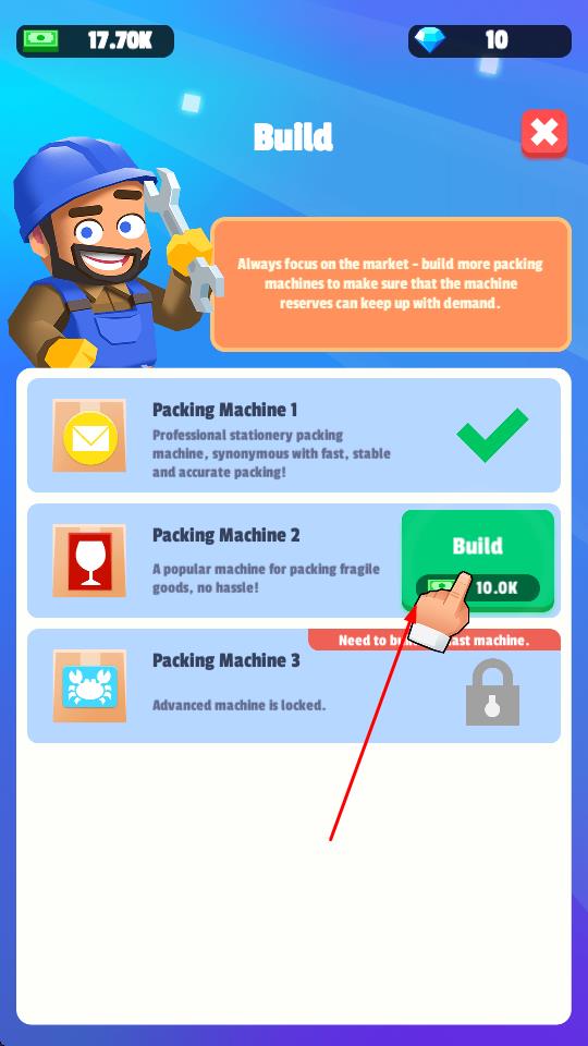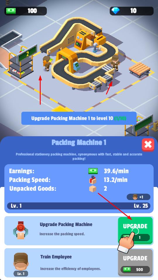 1、可對包裝機進行升級,點擊UPGRADE按鈕,提升包裝機的等級,從而增加包裝速度、收入等,讓包裝機更高效地完成文具等物品的包裝工作。
