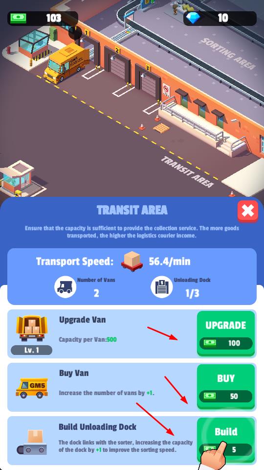 2、在轉(zhuǎn)運區(qū)域,能升級貨車,提升每輛貨車的容量;也可購買新貨車,增加貨車數(shù)量;還能建造卸貨碼頭,提升分揀速度,確保貨物運輸效率。